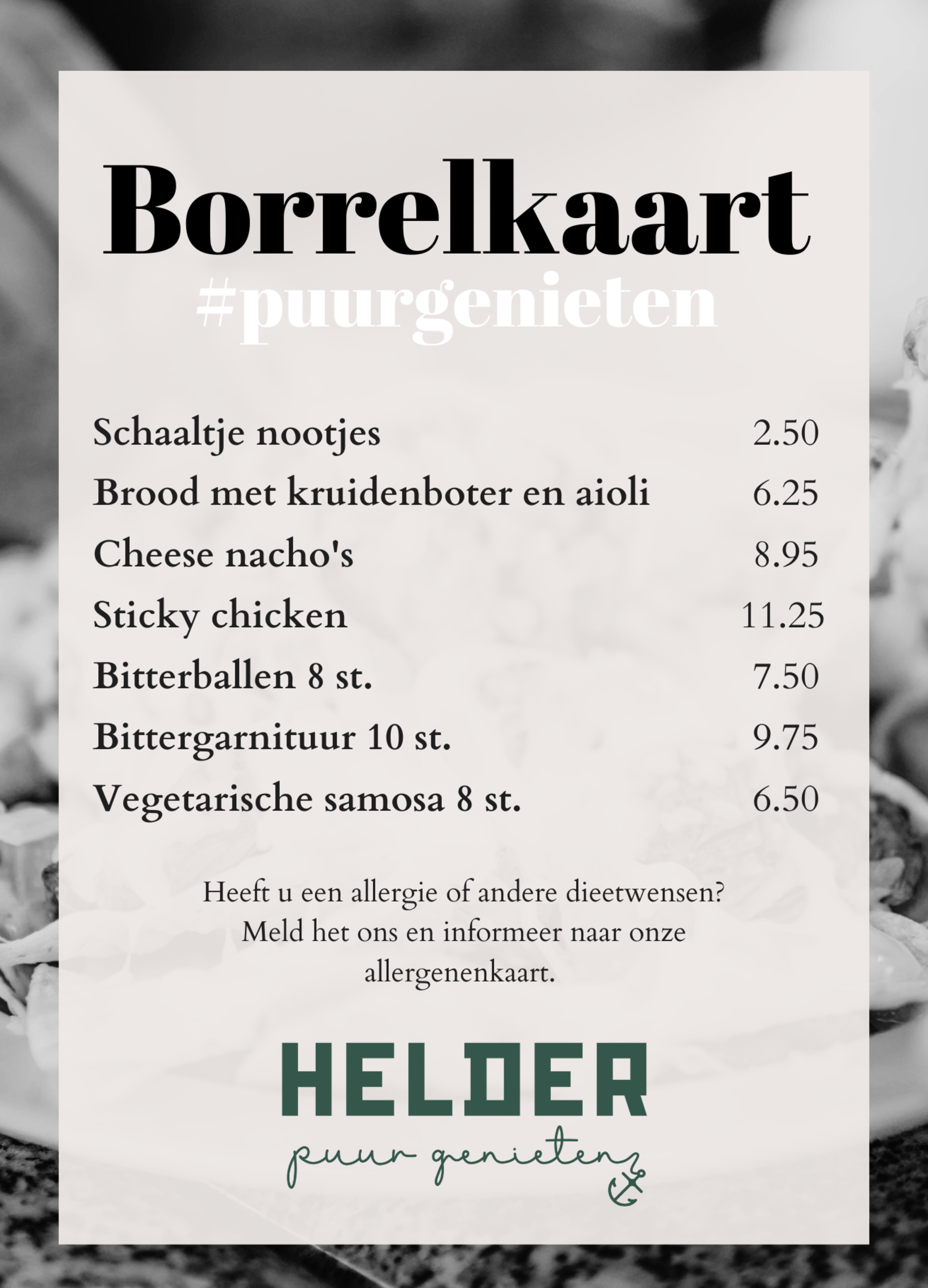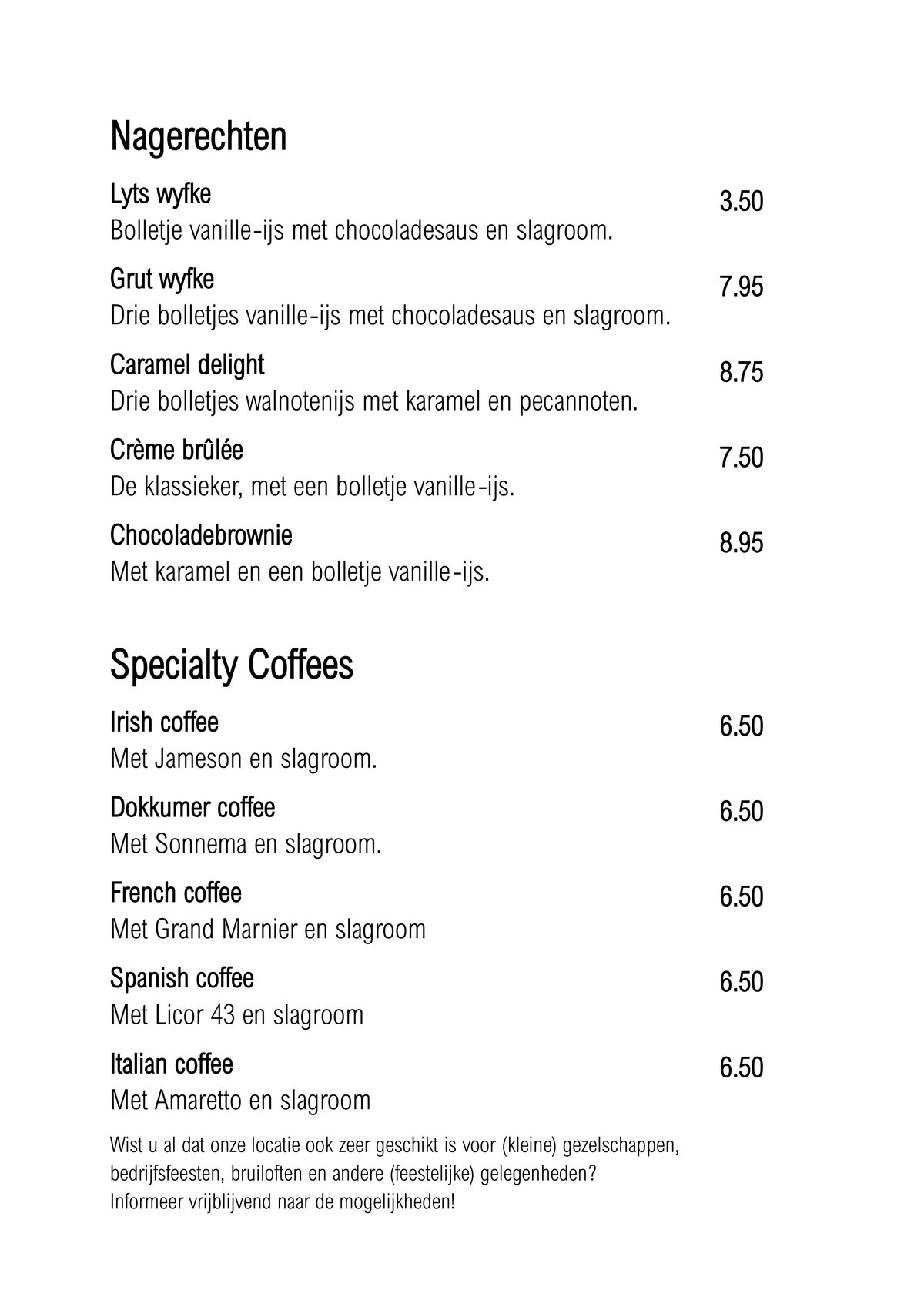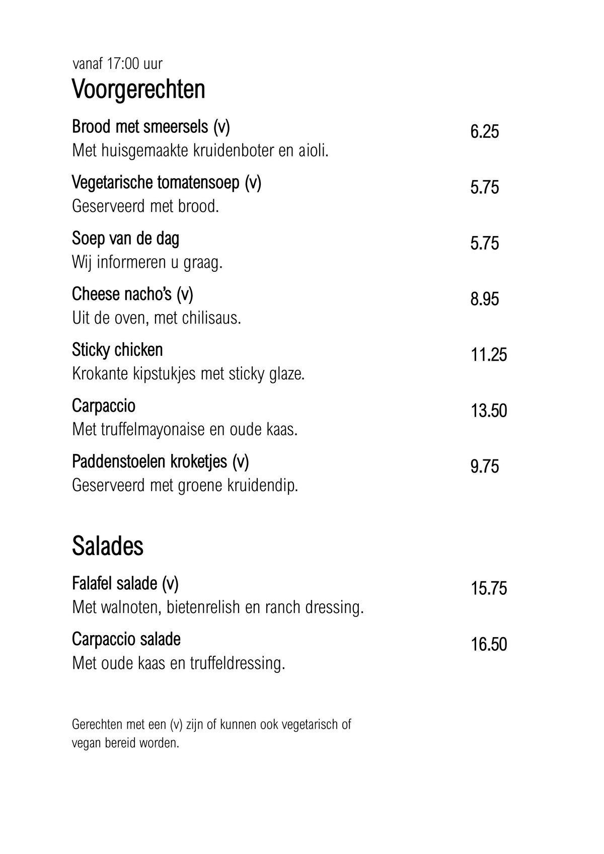 Op deze pagina vindt u onze actuele lunchkaart, dinerkaart, drankenkaart, wijnkaart en borrelkaart. Uiteraard is het mogelijk rekening te houden met dieetwensen, wij informeren u graag.